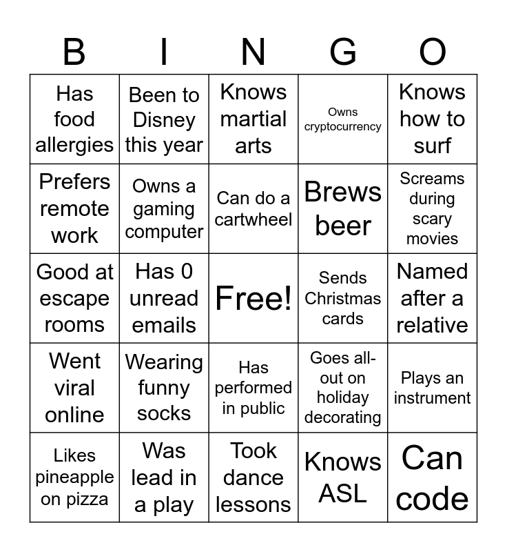 This bingo card has a free space and 34 words: Has a side hustle, Knows ASL, Appeared in a movie, Met a celebrity, Went viral online, Owns a gaming computer, Knows how to surf, Likes pineapple on pizza, Been to Disney this year, Does Yoga, Can do a cartwheel, Knows martial arts, Attended a concert this year, Spelling bee champ, Sends Christmas cards, Screams during scary movies, Was lead in a play, Good at escape rooms, Wearing funny socks, Goes all-out on holiday decorating, Has performed in public, Listens to podcasts, Has food allergies, Named after a relative, Took dance lessons, Can code, Owns cryptocurrency, Can drive stick, Brews beer, Prefers remote work, Drinks 3+ cups coffee a day, Has 0 unread emails, Plays an instrument and Read 10+ books this year.