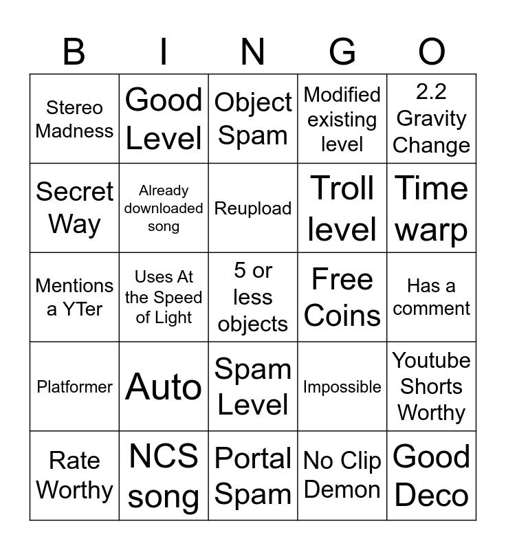 This bingo card has a free space and 24 words: Auto, NCS song, Reupload, Rate Worthy, 2.2 Gravity Change, Stereo Madness, Secret Way, Good Level, Free Coins, Spam Level, Troll level, Mentions a YTer, Impossible, Youtube Shorts Worthy, Already downloaded song, No Clip Demon, Has a comment, Object Spam, Time warp, Uses At the Speed of Light, Good Deco, Platformer, Modified existing level and Portal Spam.