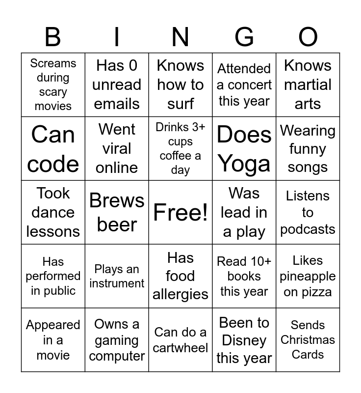 This bingo card has a free space and 29 words: Appeared in a movie, Good at escape rooms, Brews beer, Spelling Bee Champ, Screams during scary movies, Knows how to surf, Went viral online, Plays an instrument, Was lead in a play, Owns a gaming computer, Listens to podcasts, Sends Christmas Cards, Can do a cartwheel, Been to Disney this year, Wearing funny songs, Listens to podcasts, Has food allergies, Has performed in public, Knows martial arts, Took dance lessons, Read 10+ books this year, Can drive stick, Does Yoga, Can code, Attended a concert this year, Has 0 unread emails, Likes pineapple on pizza, Drinks 3+ cups coffee a day and Owns cryptocurrency.