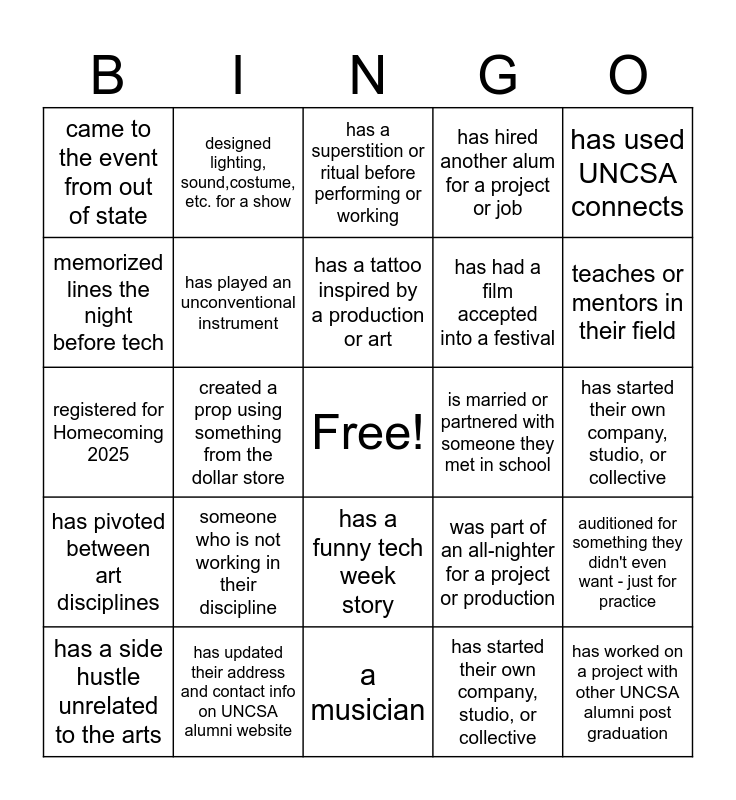 This bingo card has a free space and 25 words: someone who is not working in their discipline, a musician, has a tattoo inspired by a production or art, has a side hustle unrelated to the arts, has used UNCSA connects, came to the event from out of state, memorized lines the night before tech, designed lighting, sound,costume, etc. for a show, is married or partnered with someone they met in school, has a funny tech week story, has had a film accepted into a festival, registered for Homecoming 2025, was part of an all-nighter for a project or production, auditioned for something they didn't even want - just for practice, has played an unconventional instrument, has a group chat with fellow alumni still going, has started their own company, studio, or collective, has a superstition or ritual before performing or working, teaches or mentors in their field, created a prop using something from the dollar store, has worked on a project with other UNCSA alumni post graduation, has updated their address and contact info on UNCSA alumni website, has pivoted between art disciplines, has hired another alum for a project or job and has started their own company, studio, or collective.