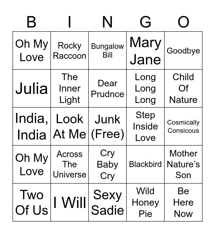 This bingo card has a free space and 24 words: Two Of Us, Across The Universe, Dear Prudnce, Wild Honey Pie, Goodbye, Oh My Love, Rocky Raccoon, Bungalow Bill, Step Inside Love, Cosmically Consicous, India, India, The Inner Light, Blackbird, Mother Nature’s Son, Julia, I Will, Sexy Sadie, Mary Jane, Child Of Nature, Oh My Love, Look At Me, Cry Baby Cry, Long Long Long and Be Here Now.