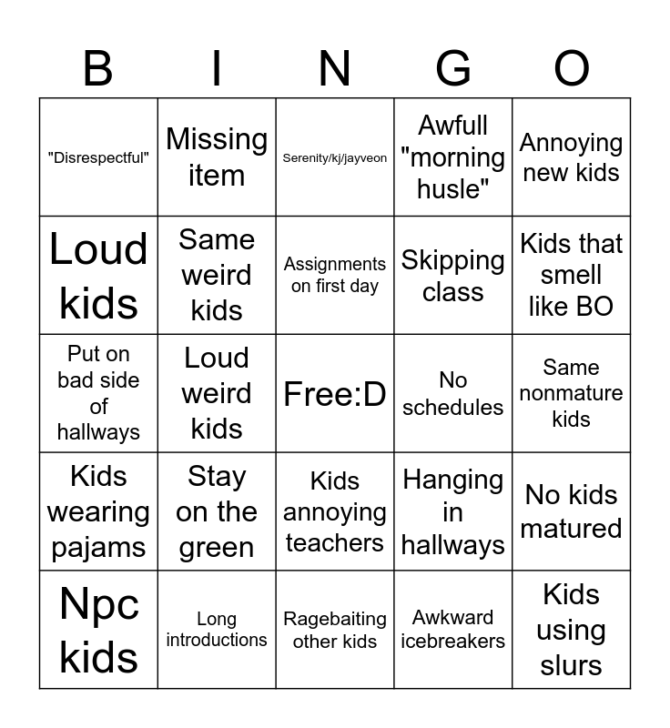 This bingo card has a free space and 24 words: Stay on the green, Long introductions, Assignments on first day, Npc kids, Annoying new kids, "Disrespectful", Loud kids, Missing item, No schedules, Kids annoying teachers, Skipping class, Put on bad side of hallways, Hanging in hallways, No kids matured, Same weird kids, Awkward icebreakers, Same nonmature kids, Serenity/kj/jayveon, Kids that smell like BO, Loud weird kids, Kids using slurs, Kids wearing pajams, Awfull "morning husle" and Ragebaiting other kids.