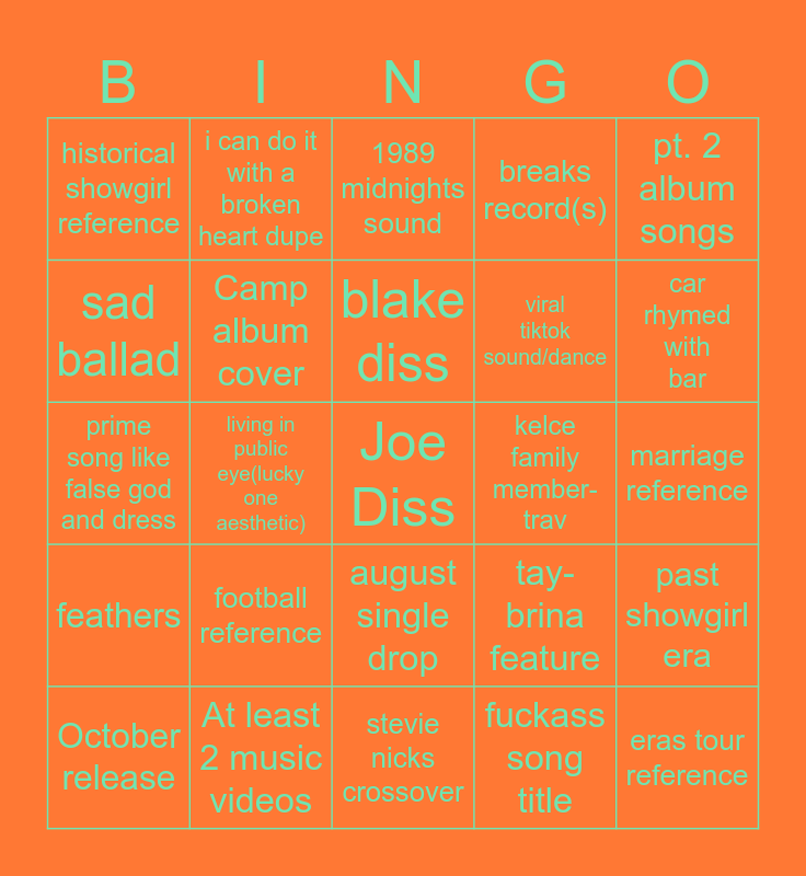 This bingo card has a free space and 24 words: October release, football reference, blake diss, fuckass song title, pt. 2 album songs, historical showgirl reference, i can do it with a broken heart dupe, 1989 midnights sound, kelce family member-trav, marriage reference, prime song like false god and dress, Camp album cover, tay-brina feature, past showgirl era, sad ballad, At least 2 music videos, stevie nicks crossover, breaks record(s), car rhymed with bar, feathers, living in public eye(lucky one aesthetic), august single drop, viral tiktok sound/dance and eras tour reference.