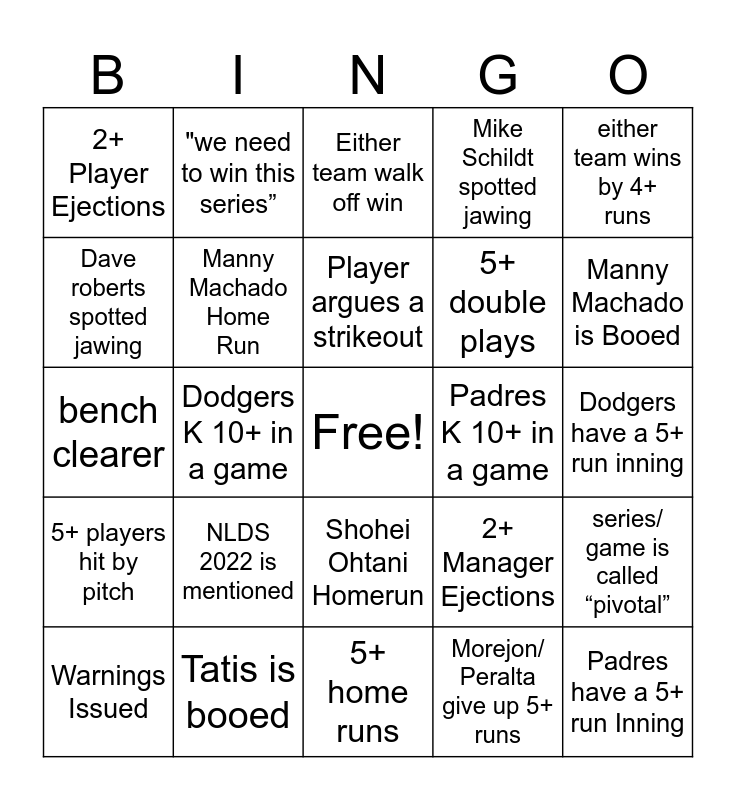 This bingo card has a free space and 24 words: NLDS 2022 is mentioned, Tatis is booed, Player argues a strikeout, Warnings Issued, either team wins by 4+ runs, 2+ Player Ejections, Dave roberts spotted jawing, "we need to win this series”, Padres K 10+ in a game, Shohei Ohtani Homerun, 5+ double plays, bench clearer, 2+ Manager Ejections, series/ game is called “pivotal”, Manny Machado Home Run, Morejon/ Peralta give up 5+ runs, Dodgers have a 5+ run inning, Either team walk off win, Manny Machado is Booed, Dodgers K 10+ in a game, Padres have a 5+ run Inning, 5+ players hit by pitch, Mike Schildt spotted jawing and 5+ home runs.