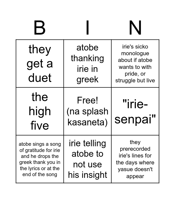 This bingo card has a free space and 8 words: "irie-senpai", irie's sicko monologue about if atobe wants to with pride, or struggle but live, atobe thanking irie in greek, atobe sings a song of gratitude for irie and he drops the greek thank you in the lyrics or at the end of the song, they get a duet, they prerecorded irie's lines for the days where yasue doesn't appear, the high five and irie telling atobe to not use his insight.
