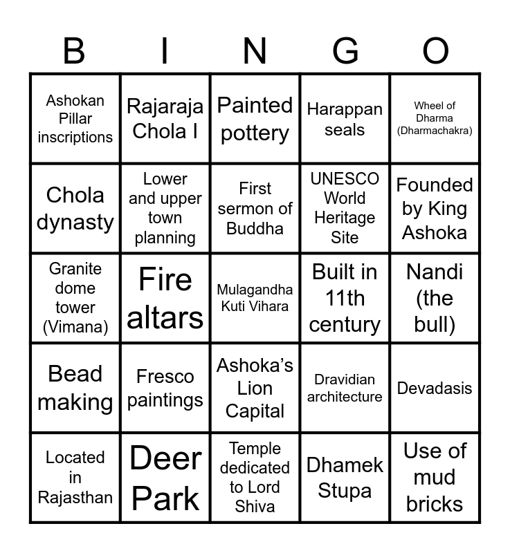 This bingo card has 26 words: Ashoka’s Lion Capital, Dhamek Stupa, First sermon of Buddha, Deer Park, Wheel of Dharma (Dharmachakra), Ashokan Pillar inscriptions, Chola dynasty, Rajaraja Chola I, Nandi (the bull), Dravidian architecture, UNESCO World Heritage Site, Granite dome tower (Vimana), Devadasis, Located in Rajasthan, Fire altars, Ploughed field remains, Harappan seals, Bead making, Painted pottery, Mulagandha Kuti Vihara, Founded by King Ashoka, Temple dedicated to Lord Shiva, Built in 11th century, Fresco paintings, Lower and upper town planning and Use of mud bricks.