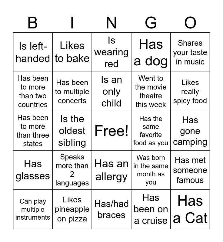This bingo card has a free space and 24 words: Speaks more than 2 languages, Likes pineapple on pizza, Is an only child, Can play multiple instruments, Shares your taste in music, Is left-handed, Has been to more than two countries, Likes to bake, Has the same favorite food as you, Has an allergy, Went to the movie theatre this week, Has been to more than three states, Was born in the same month as you, Has met someone famous, Has been to multiple concerts, Has been on a cruise, Has gone camping, Is wearing red, Likes really spicy food, Is the oldest sibling, Has a Cat, Has glasses, Has a dog and Has/had braces.