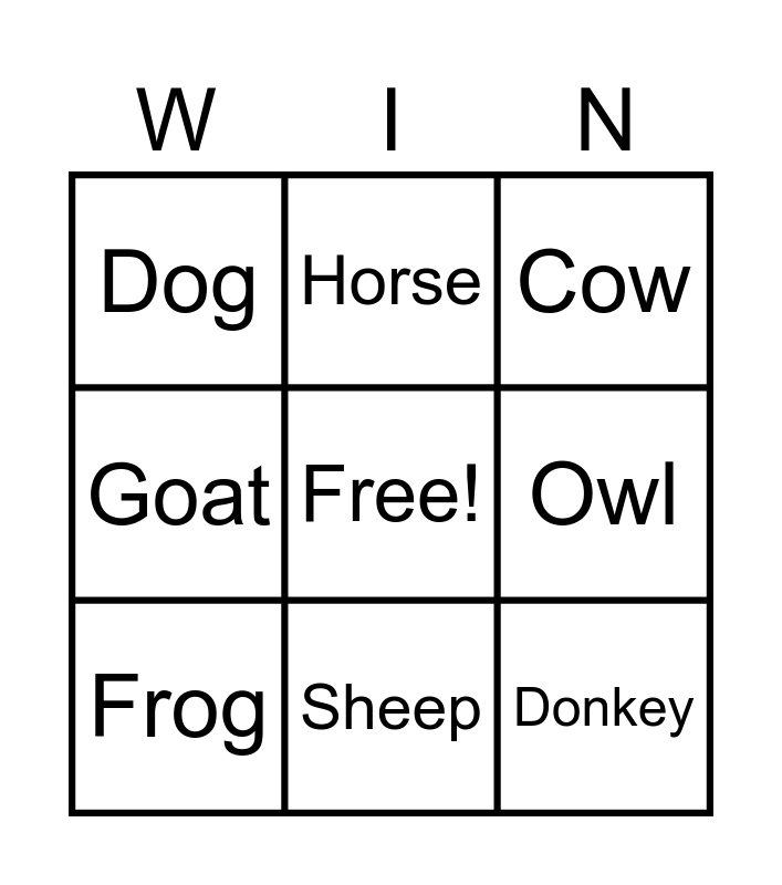 This bingo card has a free space and 18 words: Rooster, Duck, Cow, Dog, Cat, Goat, Lion, Horse, Sheep, Snake, Elephant, Donkey, Wolf, Owl, Frog, Chicken, Pig and Raccoon.