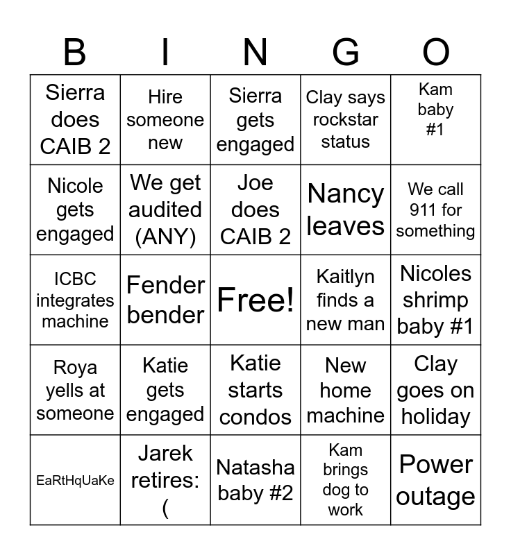 This bingo card has a free space and 24 words: Katie gets engaged, Jarek retires:(, Joe does CAIB 2, EaRtHqUaKe, Kam baby #1, Sierra does CAIB 2, Nicole gets engaged, Hire someone new, Kaitlyn finds a new man, Katie starts condos, Nancy leaves, ICBC integrates machine, New home machine, Clay goes on holiday, We get audited (ANY), Kam brings dog to work, Nicoles shrimp baby #1, Sierra gets engaged, We call 911 for something, Fender bender, Power outage, Roya yells at someone, Clay says rockstar status and Natasha baby #2.
