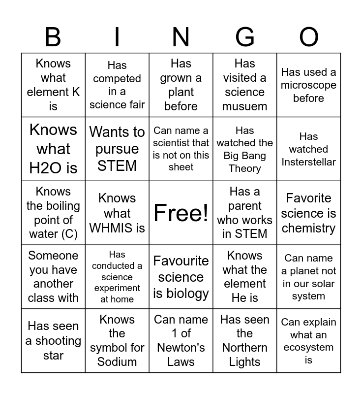 This bingo card has a free space and 24 words: Has conducted a science experiment at home, Knows the symbol for Sodium, Can name a scientist that is not on this sheet, Has seen a shooting star, Has used a microscope before, Knows what element K is, Knows what H2O is, Has competed in a science fair, Has a parent who works in STEM, Favourite science is biology, Has watched the Big Bang Theory, Knows the boiling point of water (C), Knows what the element He is, Can name a planet not in our solar system, Wants to pursue STEM, Has seen the Northern Lights, Favorite science is chemistry, Has grown a plant before, Has watched Insterstellar, Knows what WHMIS is, Can explain what an ecosystem is, Someone you have another class with, Has visited a science musuem and Can name 1 of Newton's Laws.