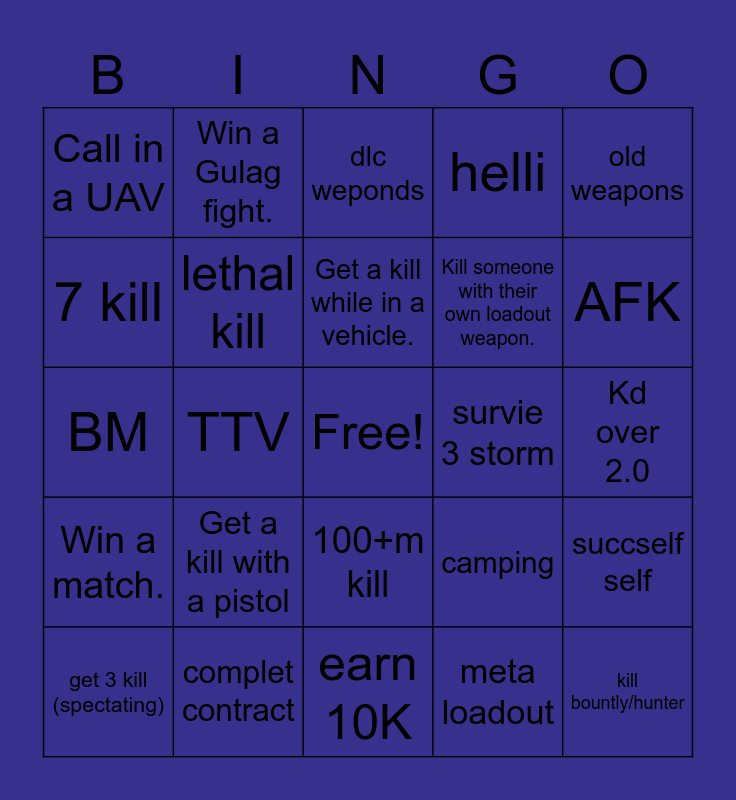 This bingo card has a free space and 24 words: Get a kill with a pistol, complet contract, Get a kill while in a vehicle., get 3 kill (spectating), old weapons, Call in a UAV, 7 kill, Win a Gulag fight., survie 3 storm, 100+m kill, Kill someone with their own loadout weapon., BM, camping, succself self, lethal kill, meta loadout, Kd over 2.0, dlc weponds, AFK, TTV, kill bountly/hunter, Win a match., helli and earn 10K.