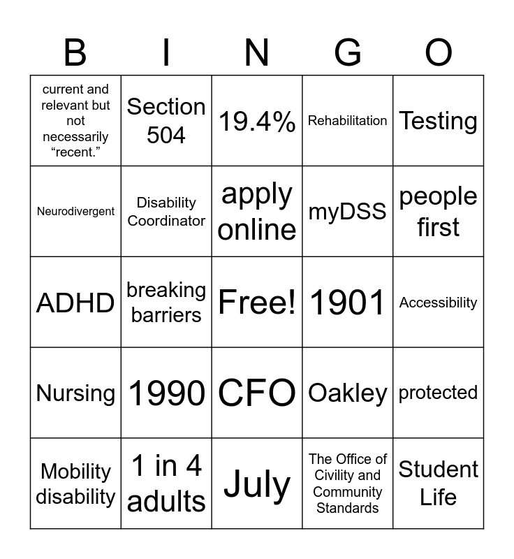 This bingo card has a free space and 24 words: 1990, 1 in 4 adults, apply online, Mobility disability, Testing, current and relevant but not necessarily “recent.”, Neurodivergent, Section 504, 1901, CFO, myDSS, ADHD, Oakley, protected, Disability Coordinator, The Office of Civility and Community Standards, Accessibility, 19.4%, people first, breaking barriers, Student Life, Nursing, Rehabilitation and July.