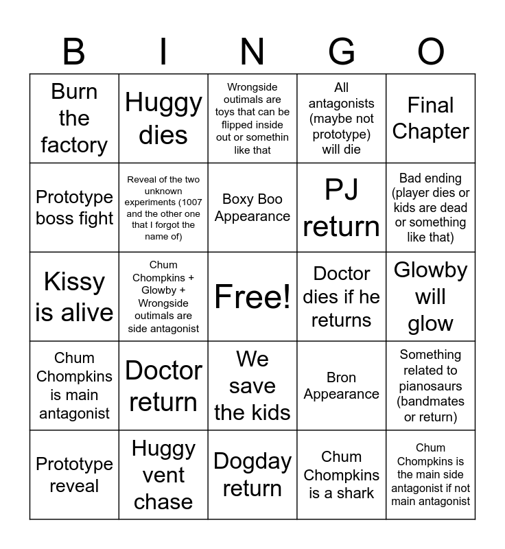 This bingo card has a free space and 24 words: Doctor return, Huggy vent chase, Boxy Boo Appearance, Prototype reveal, Final Chapter, Burn the factory, Prototype boss fight, Huggy dies, Doctor dies if he returns, We save the kids, PJ return, Kissy is alive, Bron Appearance, Something related to pianosaurs (bandmates or return), Reveal of the two unknown experiments (1007 and the other one that I forgot the name of), Chum Chompkins is a shark, Glowby will glow, Wrongside outimals are toys that can be flipped inside out or somethin like that, Bad ending (player dies or kids are dead or something like that), Chum Chompkins + Glowby + Wrongside outimals are side antagonist, Chum Chompkins is the main side antagonist if not main antagonist, Chum Chompkins is main antagonist, All antagonists (maybe not prototype) will die and Dogday return.