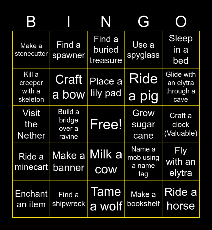 This bingo card has a free space and 92 words: Craft a shield, Find a desert temple, Tame a wolf, Trade with a villager, Smelt iron, Kill a witch, Make a cake, Enchant an item, Build a nether portal, Find a diamond, Free space (Inventory), Catch a fish, Make a map, Ride a pig, Make a snow golem, Sleep in a bed, Find a buried treasure, Kill an enderman, Get a music disc, Shear a sheep, Make a potion, Find an amathist geode, Breed two animals, Collect 64 coal, Make a banner, Craft a bow, Get a trident, Use a grindstone, Eat suspicious stew, Kill a pillager with banner, Find a shipwreck, Milk a cow, Get honey from a beehive, Cook something in a smoker, Find a spawner, Ring a village bell, Grow a giant mushroom, Dye a piece of armor, Place a lily pad, Name a mob using a name tag, Visit the Nether, Ride a minecart, Craft a clock (Valuable), Get leather boots, Ride a horse, Find a ruined portal, Get a golden apple, Get an enchanted golden apple, Break a beehive (with or without bees), Kill a slime, Make a redstone contraption, Place a campfire, Catch an axolotl, Shoot a target block, Build something underwater, Find an igloo with secret area, Play a music disc, Kill a creeper with a skeleton, Trade with a wandering trader, Build a bridge over a ravine, Eat glow berries, Discover a lush cave, Make a netherite ingot, Get a wither skeleton skull, Craft and wear golden armor, Make a bookshelf, Use bone meal, Tame a cat, Get a crossbow, Use a fletching table, Build a secret room, Walk through a dripstone cave, Use a spyglass, Ride a strider, Find ancient debris, Loot a bastion, Fly with an elytra, Visit the End, Kill the Ender Dragon, Find an end city, Build a mob farm, Grow sugar cane, Make a stonecutter, Use a blast furnace, Use a fishing rod to pull a mob, Grow and harvest beetroot, Create a banner pattern, Use a lodestone, Lead a parade of animals, Watch a sunset from a mountain, Glide with an elytra through a cave and Collect 3 different potions.