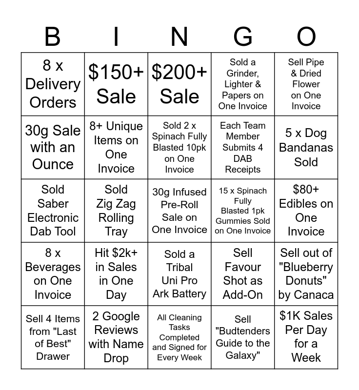 This bingo card has a free space and 24 words: Hit $2k+ in Sales in One Day, 2 Google Reviews with Name Drop, Sold 2 x Spinach Fully Blasted 10pk on One Invoice, Sell 4 Items from "Last of Best" Drawer, Sell Pipe & Dried Flower on One Invoice, 8 x Delivery Orders, 30g Sale with an Ounce, $150+ Sale, 15 x Spinach Fully Blasted 1pk Gummies Sold on One Invoice, Sold a Tribal Uni Pro Ark Battery, Each Team Member Submits 4 DAB Receipts, Sold Saber Electronic Dab Tool, Sell Favour Shot as Add-On, Sell out of "Blueberry Donuts" by Canaca, 8+ Unique Items on One Invoice, Sell "Budtenders Guide to the Galaxy", $80+ Edibles on One Invoice, $200+ Sale, 5 x Dog Bandanas Sold, Sold Zig Zag Rolling Tray, $1K Sales Per Day for a Week, 8 x Beverages on One Invoice, Sold a Grinder, Lighter & Papers on One Invoice and All Cleaning Tasks Completed and Signed for Every Week.