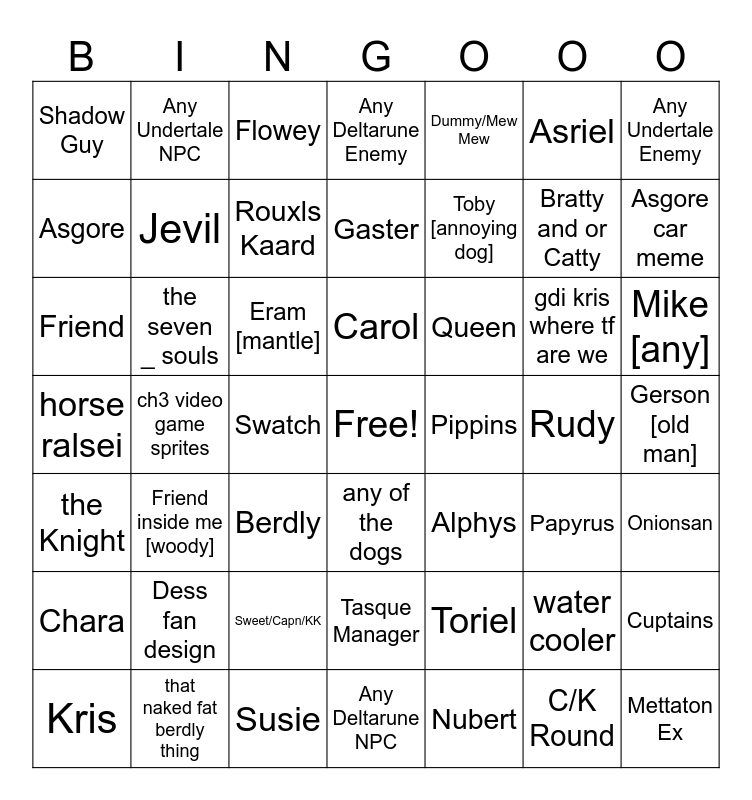 This bingo card has a free space and 76 words: Frisk, Chara, Flowey, Toriel, Napstablook, Sans, Papyrus, Undyne, Alphys, Mettaton [box], Mettaton Ex, Muffet, Asgore, Asriel, Temmie, Toby [annoying dog], Gerson [old man], Bratty and or Catty, Burgerpants, Dummy/Mew Mew, any of the dogs, Gaster, Any Undertale Enemy, Any Undertale NPC, Any Deltarune Enemy, Any Deltarune NPC, Kris, Susie, Ralsei, Noelle, Berdly, Lancer, King, Queen, Rouxls Kaard, Jevil, Seam, Spamton, Friend, Swatch, Tasque Manager, Sweet/Capn/KK, C/K Round, Tenna, Elnina/Lanino, Pippins, Mike [any], Shadow Guy, Ramb, Jockington/Catti, Rudy, Carol, Nice Cream guy, Onionsan, Nubert, Starwalker, the Knight, water cooler, Mizzle/Miss Mizzle, Cuptains, Eram [mantle], Jackenstein/Pumpkin, Ralsei with a blunt/gun, Thrash Machine/duck, Titan, Dess fan design, Asgore car meme, Friend inside me [woody], Asriel big eyes meme, that naked fat berdly thing, gdi kris where tf are we, the seven _ souls, horse ralsei, ch2 plushies, ch3 video game sprites and Spamton/Friend eyes on another drawing.