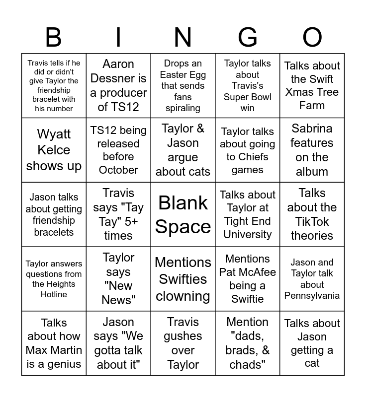 This bingo card has a free space and 69 words: Taylor says "Travie", Talks about the TikTok theories, Taylor and Travis kiss, Travis wears Taylor's merch, Jason says "We gotta talk about it", TS12 being released someday in October, Taylor talks about Travis's Super Bowl win, Intern Brandon drinks from his Eras Movie cup, Talks about the Swift Xmas Tree Farm, Taylor answers "What is your welcome to the NFL moment?", Jason and Taylor talk about Pennsylvania, Taylor explains the "Fuckass Filter", Travis tells if he did or didn't give Taylor the friendship bracelet with his number, Drops an Easter Egg that sends fans spiraling, Talks about how Shellback is a genius, Travis says "Tay Tay" 5+ times, Mentions Swifties clowning, Taylor talks about going to Chiefs games, TS12 being released before October, Taylor answers questions from the Heights Hotline, Talks about Taylor at Tight End University, Mentions Pat McAfee being a Swiftie, Sabrina features on the album, Jack Antonoff is a producer of TS12, Taylor says "Trav", Talks about Trav and Tay going to other sport games together, Elliotte Kelce shows up, Kelce Bros. talk about fav TS song, Mention "dads, brads, & chads", Taylor says "KillaTrav", Aaron Dessner is a producer of TS12, Taylor switching teams from Eagles to Chiefs, Drops a lyric as an Easter Egg, Talks about the Easter Eggs that led up to this album, Taylor answers twitter questions from 92 Percenters & Swifties, TS12 being released after October, Travis calls her "Babe", Jason wears Taylor's merch, Wyatt Kelce shows up, Taylor Talks about Ed Kelce, Taylor says "New News", Talks about Jason getting a cat, There is a Kylie Kelce mention, TS12 single released date is 8/22, TS12 being released the week of 10/12, Talks about how Max Martin is a genius, Taylor being an Eagles fan, Talks about Taylor meeting Kelce family, Taylor & Jason at the Buffalo Chiefs game, TS12 being released before October, Taylor & Jason argue about cats, Someone says "Are you ready for it?", First TS12 single is revealed, Travis gushes over Taylor, Jason praises the Eras Tour, The number 13 appears or mentioned, Talks about the wild theories, Taylor laughs so hard she snorts, Taylor talks about writing songs at 3 am, Jason talks about getting friendship bracelets, Talks about Travis being in the Eras Tour, Taylor brings up Kelce brothers losing at Karaoke, Taylor talks about Ma Kelce, Travis praises the Eras Tour, Taylor is excited for the football season, Talks about TS12 music video, Travis interrupts to gush about her, Kelce Bros. have "13" on their hand and Gracie Abrams features on the album.