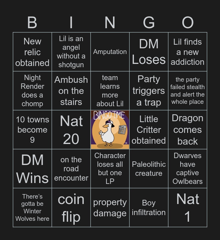 This bingo card has a free space and 24 words: on the road encounter, coin flip, team learns more about Lil, There’s gotta be Winter Wolves here, Lil finds a new addiction, New relic obtained, Night Render does a chomp, Lil is an angel without a shotgun, Little Critter obtained, Character loses all but one LP, Party triggers a trap, 10 towns become 9, Paleolithic creature, Dwarves have captive Owlbears, Ambush on the stairs, Boy infiltration, Dragon comes back, Amputation, the party failed stealth and alert the whole place, Nat 20, Nat 1, DM Wins, DM Loses and property damage.