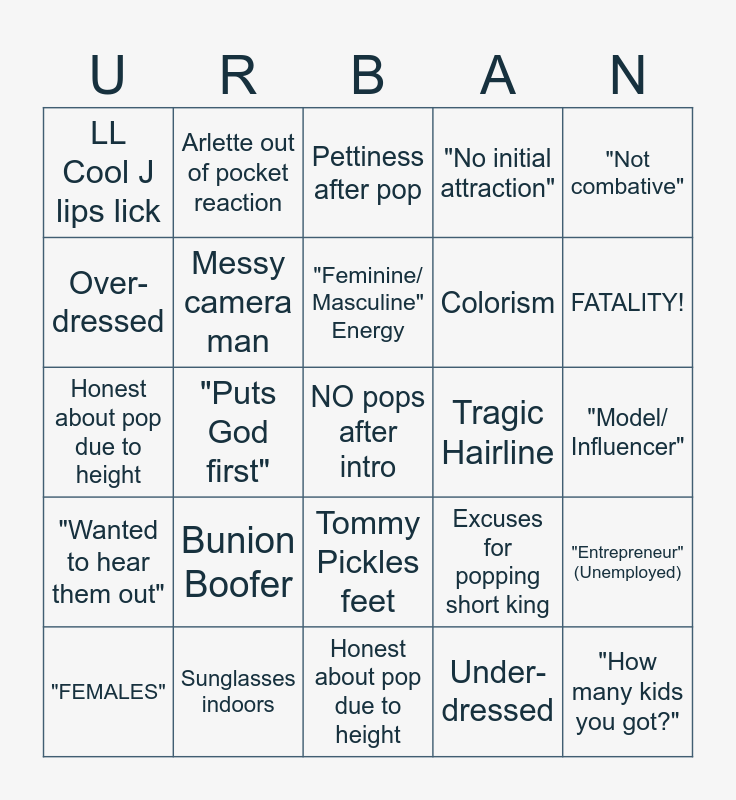 This bingo card has a free space and 24 words: Bunion Boofer, Sunglasses indoors, "Feminine/ Masculine" Energy, "FEMALES", "Not combative", LL Cool J lips lick, Over-dressed, Arlette out of pocket reaction, Tragic Hairline, Tommy Pickles feet, Colorism, Honest about pop due to height, Excuses for popping short king, "Entrepreneur" (Unemployed), Messy camera man, Under-dressed, "Model/ Influencer", Pettiness after pop, FATALITY!, "Puts God first", "How many kids you got?", "Wanted to hear them out", "No initial attraction" and Honest about pop due to height.