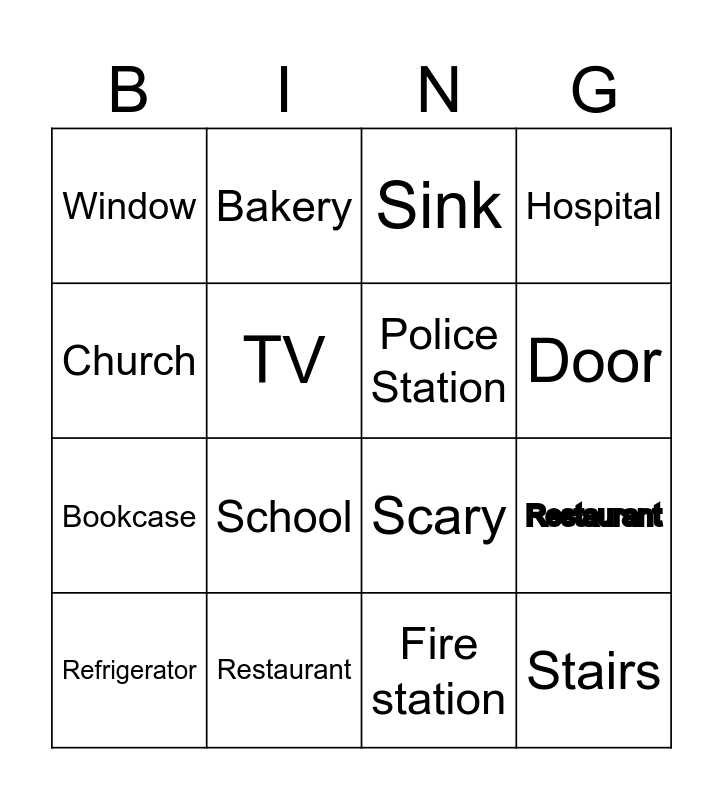 This bingo card has 16 words: Restaurant, Restaurant, Sink, Window, Bookcase, Bakery, Scary, Fire station, Church, TV, Refrigerator, Hospital, School, Door, Police Station and Stairs.