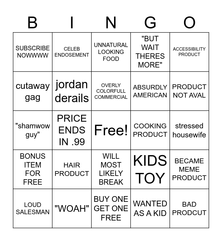 This bingo card has a free space and 45 words: GOOD PRODUCT, BAD PRODCUT, BAD ACTING, LOUD SALESMAN, PERSON DROPS SOMETHING, WANTED AS A KID, UNNATURAL LOOKING FOOD, BLACK AND WHITE SLOMO, ACCESSIBILITY PRODUCT, "WOAH", "BUT WAIT THERES MORE", COOKING PRODUCT, WILL MOST LIKELY BREAK, HAIR PRODUCT, INSTALLMENT PAYMENTS, BUY ONE GET ONE FREE, BILLY MAYS, "shamwow guy", PRODUCT STILL AVAL, PRODUCT NOT AVAL, CELEB ENDOSEMENT, POTENTIALLY DANGEROUS, clumsy white people, SUBSCRIBE NOWWWW, "why does this exist", stressed housewife, catch phrase/ theme song, SPILLS SOMETHING ON SHIRT, KIDS TOY, BONUS ITEM FOR FREE, "OFFER EXPIRES SOON"/ LIMITED TIME, BECAME MEME PRODUCT, "TWICE THE VALUE", LIFETIME GUARENTEE, "are you tired of...", PRICE ENDS IN .99, ACTUALLY OWN THIS, "x easy payments of", PRICE ENDS IN .95, OVERLY COLORFULL COMMERCIAL, cutaway gag, ABSURDLY AMERICAN, fatherless antics, jordan derails and chat derails.