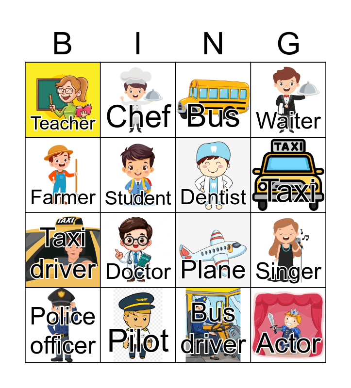 This bingo card has 16 images and 16 words: Pilot, Singer, Bus, Teacher, Taxi driver, Chef, Plane, Bus driver, Farmer, Student, Police officer, Waiter, Doctor, Taxi, Dentist and Actor.