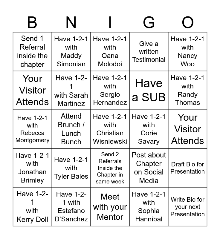This bingo card has a free space and 34 words: Have 1-2-1 with Yo Armendariz, Have 1-2-1 with Sophia Hannibal, Have 1-2-1 with Suzy Morales, Have 1-2-1 with Scott Vasquez, Have 1-2-1 with Jonathan Brimley, Have 1-2-1 with Sarah Martinez, Have 1-2-1 with Nancy Woo, Have 1-2-1 with Kerry Doll, Have 1-2-1 with Maddy Simonian, Have 1-2-1 with Kari Ivey, Have 1-2-1 with Sergio Hernandez, Have 1-2-1 with Oana Molodoi, Have 1-2-1 with Daniel Diaz, Have 1-2-1 with Kevin Casey, Have 1-2-1 with Corie Savary, Have 1-2-1 with Randy Thomas, Have 1-2-1 with Estefano D’Sanchez, Have 1-2-1 with Rebecca Montgomery, Have 1-2-1 with Tyler Bales, Post about Chapter on Social Media, Send 2 Referrals Inside the Chapter in same week, Have Perfect Attendance (Sub is ok) thru OCT 2 meeting, Send 1 Referral inside the chapter, Your Visitor Attends, Meet with your Mentor, Write Bio for your next Presentation, Give a written Testimonial, Update your BNI Profile, Have a SUB, Your Visitor Attends, Attend Leadership meeting, Attend Brunch / Lunch Bunch, Draft Bio for Presentation and Attend CSF.