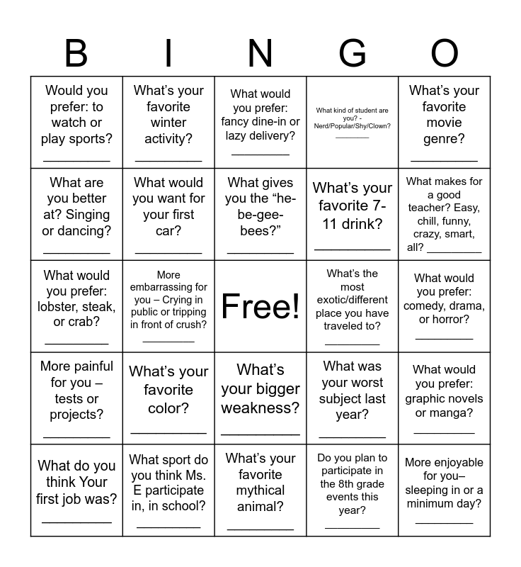 This bingo card has a free space and 25 words: What’s your favorite color? _________, What’s your favorite mythical animal? _________, What gives you the “he-be-gee-bees?” _________, What do you think Your first job was? _________, What’s your favorite movie genre? _________, Would you prefer: to watch or play sports? _________, What are you better at? Singing or dancing? _________, What’s your favorite winter activity? _________, What’s the most exotic/different place you have traveled to? _________, What’s your bigger weakness?_________, What’s your favorite 7-11 drink? _________, What would you prefer: lobster, steak, or crab? _________, What was your worst subject last year? _________, What would you prefer: graphic novels or manga? _________, What would you want for your first car? _________, What would you prefer: pizza night or taco night? _________, What would you prefer: comedy, drama, or horror? _________, What would you prefer: fancy dine-in or lazy delivery? _________, What makes for a good teacher? Easy, chill, funny, crazy, smart, all? _________, More embarrassing for you – Crying in public or tripping in front of crush? _________, More enjoyable for you– sleeping in or a minimum day? _________, What sport do you think Ms. E participate in, in school? _________, More painful for you – tests or projects? _________, What kind of student are you? - Nerd/Popular/Shy/Clown? _________ and Do you plan to participate in the 8th grade events this year? _________.