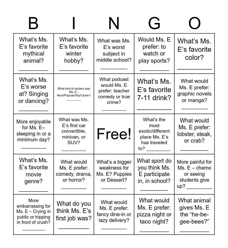 This bingo card has a free space and 25 words: What would Ms. E prefer: comedy, drama, or horror? _________, What would Ms. E prefer: fancy dine-in or lazy delivery? _________, What podcast would Ms. E prefer: teacher comedy or true crime? _________, More embarrassing for Ms. E – Crying in public or tripping in front of crush? _________, What’s Ms. E’s favorite color? _________, What’s Ms. E’s favorite mythical animal? _________, What’s Ms. E’s worse at? Singing or dancing? _________, What’s Ms. E’s favorite winter hobby? _________, What’s the most exotic/different place Ms. E’s has traveled to? _________, What’s a bigger weakness for Ms. E? Puppies or Dessert?_________, What’s Ms. E’s favorite 7-11 drink? _________, More enjoyable for Ms. E– sleeping in or a minimum day? _________, What sport do you think Ms. E participate in, in school? _________, More painful for Ms. E – chemo or seeing students give up? _________, What kind of student was Ms. E - Nerd/Popular/Shy/Clown? _________, How long has Ms. E worked at Frost? 10, 15, 20, 25, or more years? _________, What would Ms. E prefer: lobster, steak, or crab? _________, What was Ms. E’s worst subject in middle school? _________, What would Ms. E prefer: graphic novels or manga? _________, What was Ms. E’s first car convertible, minivan, or SUV? _________, What animal gives Ms. E the “he-be-gee-bees?” _________, What do you think Ms. E’s first job was? _________, What’s Ms. E’s favorite movie genre? _________, Would Ms. E prefer: to watch or play sports? _________ and What would Ms. E prefer: pizza night or taco night? _________.