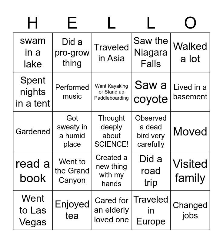 This bingo card has a free space and 24 words: Went to the Grand Canyon, Enjoyed tea, Went Kayaking or Stand up Paddleboarding, Went to Las Vegas, Walked a lot, swam in a lake, Spent nights in a tent, Did a pro-grow thing, Observed a dead bird very carefully, Created a new thing with my hands, Saw a coyote, Gardened, Did a road trip, Visited family, Performed music, Traveled in Europe, Moved, Traveled in Asia, Lived in a basement, Got sweaty in a humid place, Changed jobs, read a book, Saw the Niagara Falls and Cared for an elderly loved one.