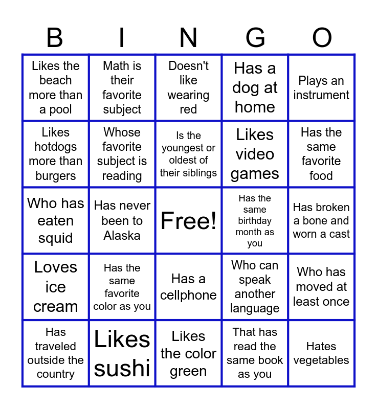 This bingo card has a free space and 24 words: Has the same favorite color as you, Likes sushi, Is the youngest or oldest of their siblings, Has traveled outside the country, Plays an instrument, Likes the beach more than a pool, Likes hotdogs more than burgers, Math is their favorite subject, Has the same birthday month as you, Has a cellphone, Likes video games, Who has eaten squid, Who can speak another language, Who has moved at least once, Whose favorite subject is reading, That has read the same book as you, Has broken a bone and worn a cast, Doesn't like wearing red, Has the same favorite food, Has never been to Alaska, Hates vegetables, Loves ice cream, Has a dog at home and Likes the color green.