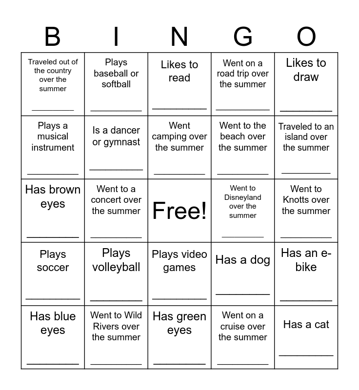 This bingo card has a free space and 24 words: Plays volleyball ________, Went to Wild Rivers over the summer __________, Went camping over the summer __________, Has blue eyes ________, Likes to draw ________, Traveled out of the country over the summer __________, Plays a musical instrument __________, Plays baseball or softball __________, Went to Disneyland over the summer __________, Plays video games _________, Went to the beach over the summer __________, Has brown eyes ________, Has a dog ________, Has an e-bike ________, Is a dancer or gymnast __________, Went on a cruise over the summer __________, Went to Knotts over the summer __________, Likes to read _________, Traveled to an island over the summer __________, Went to a concert over the summer __________, Has a cat _________, Plays soccer _________, Went on a road trip over the summer ___________ and Has green eyes ________.