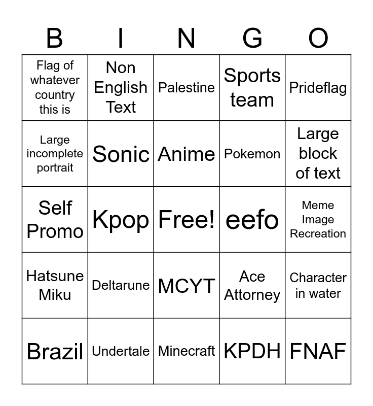This bingo card has a free space and 24 words: Deltarune, Undertale, Anime, Brazil, Prideflag, Flag of whatever country this is, Large incomplete portrait, Non English Text, eefo, MCYT, Pokemon, Self Promo, Ace Attorney, Character in water, Sonic, KPDH, Meme Image Recreation, Palestine, Large block of text, Kpop, FNAF, Hatsune Miku, Sports team and Minecraft.