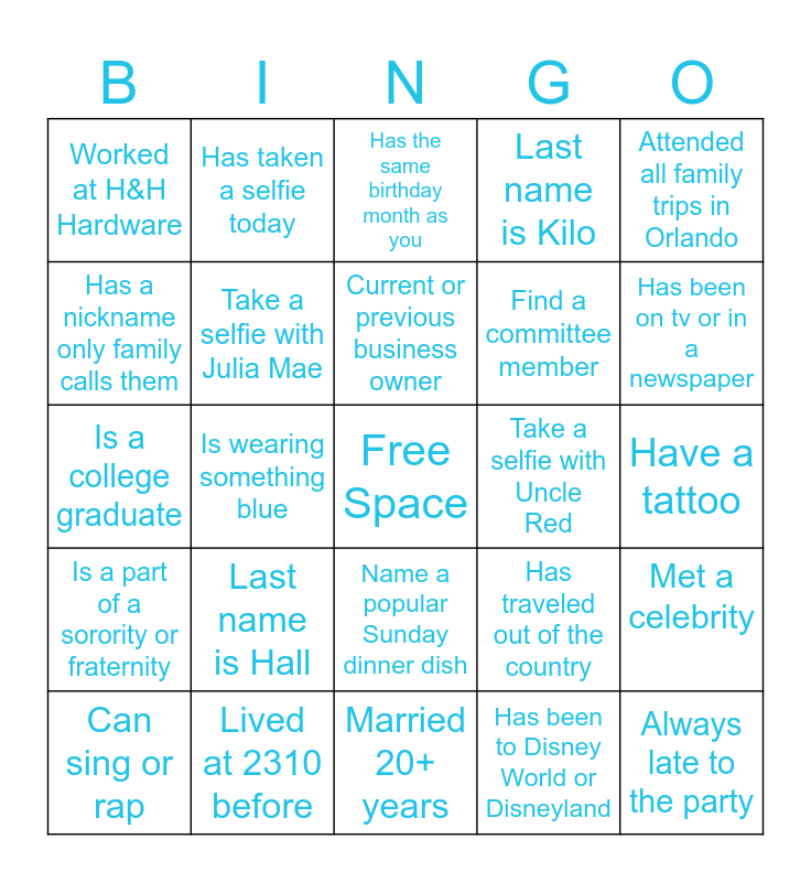 This bingo card has a free space and 24 words: Can sing or rap, Last name is Hall, Current or previous business owner, Has been to Disney World or Disneyland, Attended all family trips in Orlando, Worked at H&H Hardware, Has taken a selfie today, Has the same birthday month as you, Take a selfie with Uncle Red, Have a tattoo, Is a college graduate, Take a selfie with Julia Mae, Has traveled out of the country, Met a celebrity, Has a nickname only family calls them, Lived at 2310 before, Married 20+ years, Last name is Kilo, Has been on tv or in a newspaper, Is a part of a sorority or fraternity, Is wearing something blue, Name a popular Sunday dinner dish, Find a committee member and Always late to the party.