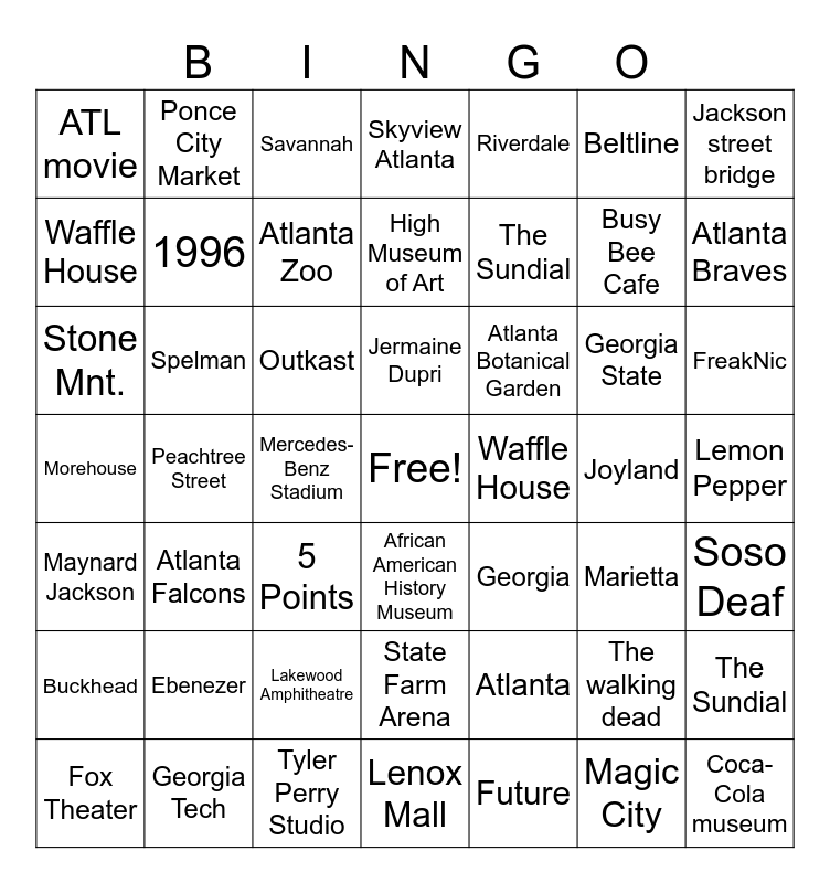 This bingo card has a free space and 76 words: Hartsfield-Jackson Atlanta International Airport, Buckhead, Savannah, Atlanta, Cascade, Decatur, Marietta, Krispy Kreme, Georgia, Peach, Coca-Cola museum, Georgia aquarium, Waffle House, Beltline, Churches chicken, The Sundial, Lemon Pepper, Busy Bee Cafe, Trap museum, Riverdale, African American History Museum, High Museum of Art, Jackson street bridge, Ponce City Market, Skyview Atlanta, Lenox Mall, Fox Theater, Tyler Perry Studio, Children Museum of Atlanta, Joyland, 5 Points, Fun spot America Atlanta, Black Wall Street market, Atlanta Botanical Garden, Atlanta Zoo, 1996, Piedmont Park, Centennial Olympic Park, Stone Mnt., Mercedes-Benz Stadium, State Farm Arena, Lakewood Amphitheatre, Magic City, Maynard Jackson, The Varsity, Waffle House, FreakNic, ATL movie, S&S Cafeteria, 5 Points, Joyland, Jermaine Dupri, Sweet Auburn, Soso Deaf, Future, Trap, Maynard Jackson, The walking dead, The hunger games, The Sundial, Outkast, Tokens, Oakland Cemetery, Love and Hip Hop, Real Housewives of ATL, Ebenezer, Atlanta Braves, Atlanta Falcons, Atlanta Hawks, Georgia Tech, Georgia State, Spelman, Morehouse, Clark Atlanta University, Peachtree Street and 2017.