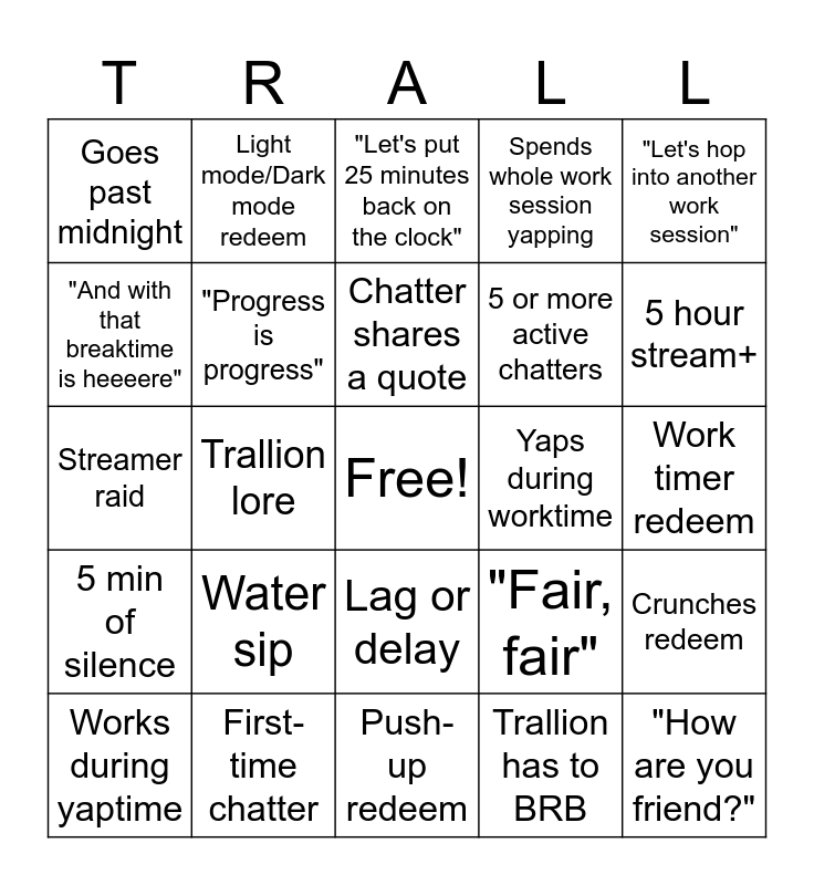 This bingo card has a free space and 25 words: Water sip, Push-up redeem, Chatter shares a quote, Works during yaptime, "Let's hop into another work session", Goes past midnight, "And with that breaktime is heeeere", Light mode/Dark mode redeem, Yaps during worktime, Lag or delay, 5 or more active chatters, Streamer raid, "Fair, fair", Crunches redeem, "Progress is progress", 1000 words written, Work timer redeem, "Let's put 25 minutes back on the clock", 5 hour stream+, Trallion lore, "How are you friend?", First-time chatter, 5 min of silence, Spends whole work session yapping and Trallion has to BRB.