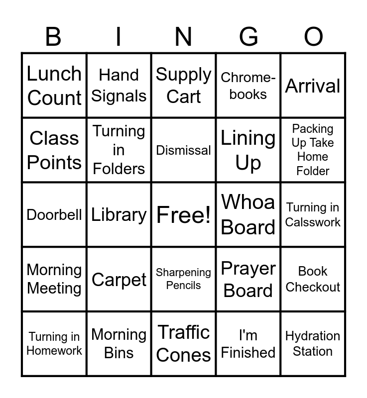 This bingo card has a free space and 24 words: Carpet, Morning Bins, Dismissal, Turning in Homework, Arrival, Lunch Count, Class Points, Hand Signals, Whoa Board, Sharpening Pencils, Lining Up, Doorbell, Prayer Board, Book Checkout, Turning in Folders, I'm Finished, Turning in Calsswork, Supply Cart, Packing Up Take Home Folder, Library, Hydration Station, Morning Meeting, Chrome-books and Traffic Cones.