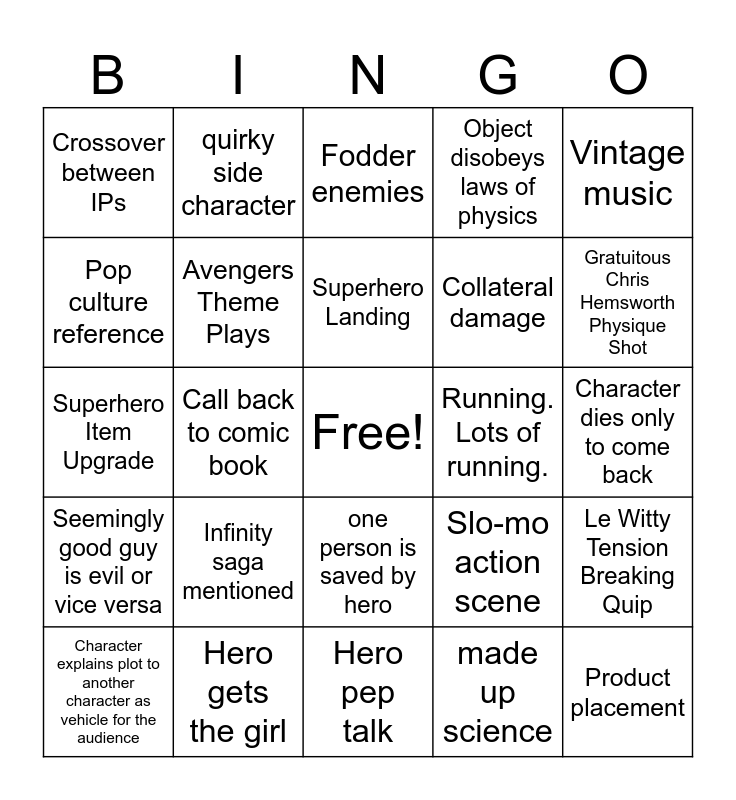 This bingo card has a free space and 24 words: Infinity saga mentioned, Hero gets the girl, Superhero Landing, Character explains plot to another character as vehicle for the audience, Vintage music, Crossover between IPs, Pop culture reference, quirky side character, Running. Lots of running., one person is saved by hero, Collateral damage, Superhero Item Upgrade, Slo-mo action scene, Le Witty Tension Breaking Quip, Avengers Theme Plays, made up science, Character dies only to come back, Fodder enemies, Gratuitous Chris Hemsworth Physique Shot, Call back to comic book, Product placement, Seemingly good guy is evil or vice versa, Object disobeys laws of physics and Hero pep talk.
