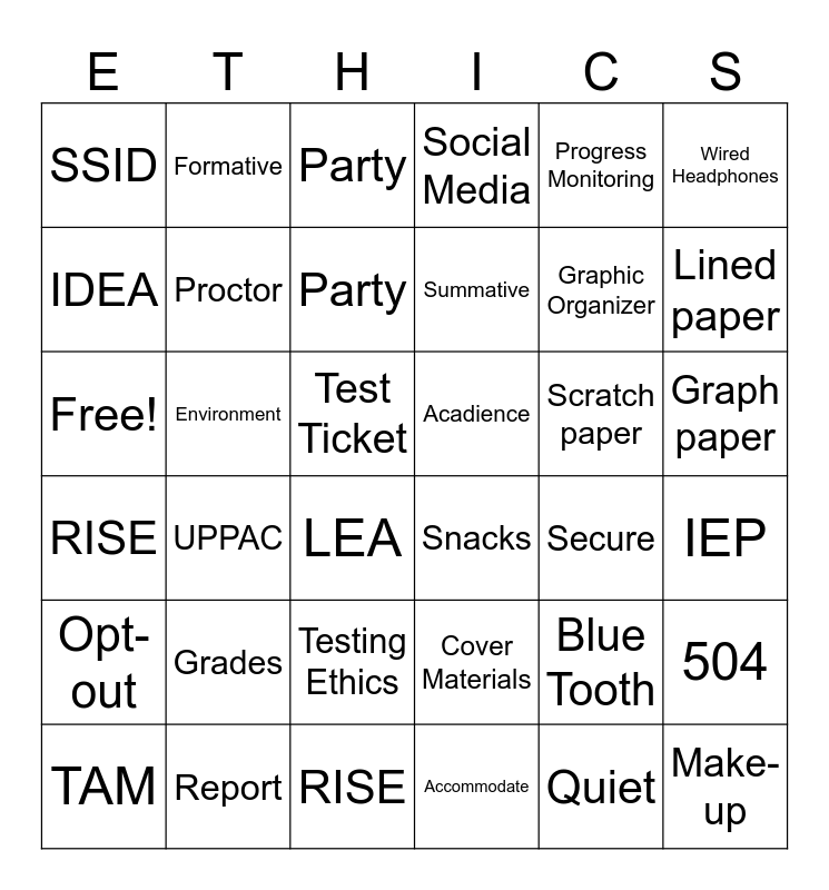 This bingo card has 36 words: Cover Materials, Testing Ethics, Accommodate, IDEA, RISE, Acadience, Proctor, RISE, Progress Monitoring, Blue Tooth, Lined paper, Social Media, 504, Environment, Summative, SSID, Opt-out, Scratch paper, Free!, Party, Test Ticket, UPPAC, Snacks, LEA, Secure, Formative, Graphic Organizer, Report, Party, Wired Headphones, Make-up, TAM, IEP, Graph paper, Grades and Quiet.