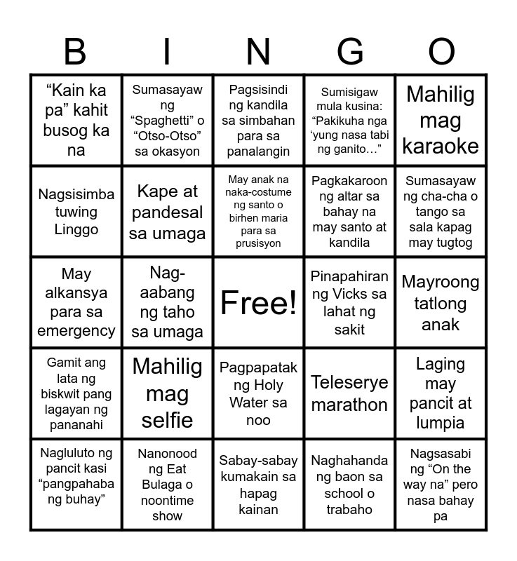 This bingo card has a free space and 29 words: Nagluluto ng pancit kasi “pangpahaba ng buhay”, May baon na skyflakes sa bag, Nag-aabang ng taho sa umaga, May “Tupperware” na galing sa ice cream o biskwit, “Kain ka pa” kahit busog ka na, Pagsisindi ng kandila sa simbahan para sa panalangin, Kape at pandesal sa umaga, Mahilig mag selfie, Pinapahiran ng Vicks sa lahat ng sakit, Nanonood ng Eat Bulaga o noontime show, Mayroong tatlong anak, Nagsasabi ng “On the way na” pero nasa bahay pa, Sabay-sabay kumakain sa hapag kainan, Naghahanda ng baon sa school o trabaho, Sumasayaw ng cha-cha o tango sa sala kapag may tugtog, Laging may pancit at lumpia, Pagpapatak ng Holy Water sa noo, Gamit ang lata ng biskwit pang lagayan ng pananahi, Mahilig mag karaoke, May alkansya para sa emergency, Teleserye marathon, Mayroong Senior Citizen card, Pagkakaroon ng altar sa bahay na may santo at kandila, Nagsisimba tuwing Linggo, Sumisigaw mula kusina: “Pakikuha nga ‘yung nasa tabi ng ganito…”, Sumasayaw ng “Spaghetti” o “Otso-Otso” sa okasyon, Laging may pancit at lumpia, May anak na naka-costume ng santo o birhen maria para sa prusisyon and Pagsusuot ng belo sa ulo ng mga babae sa misa.