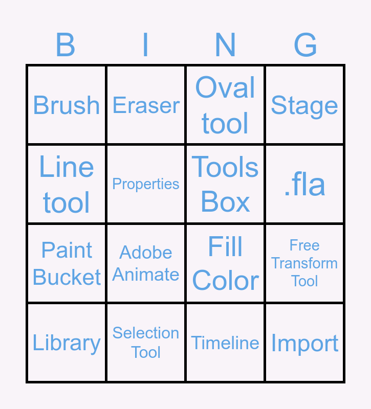This bingo card has 16 words: Selection Tool, Free Transform Tool, Oval tool, Brush, Paint Bucket, Eraser, Fill Color, Timeline, Line tool, Properties, Library, Stage, Adobe Animate, .fla, Tools Box and Import.