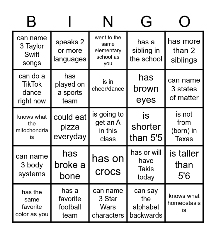 This bingo card has a free space and 24 words: has broke a bone, has a favorite football team, is in cheer/dance, has the same favorite color as you, has more than 2 siblings, can name 3 Taylor Swift songs, can do a TikTok dance right now, speaks 2 or more languages, is shorter than 5'5, has on crocs, has brown eyes, knows what the mitochondria is, has or will have Takis today, is taller than 5'6, has played on a sports team, can say the alphabet backwards, is not from (born) in Texas, went to the same elementary school as you, can name 3 states of matter, could eat pizza everyday, knows what homeostasis is, can name 3 body systems, has a sibling in the school and can name 3 Star Wars characters.