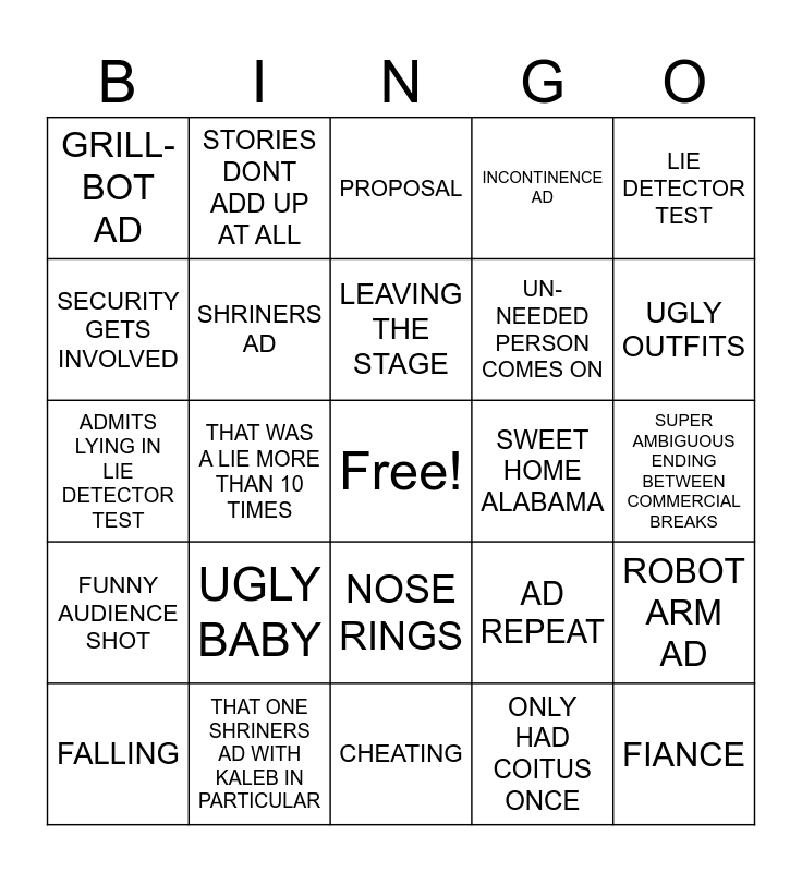 This bingo card has a free space and 50 words: EXTREME CRYING, FIANCE, YO A -GARDENING TOOL-, CHEATING, UGLY BABY, DAD SAYING HE WILL STEP (REGARDLESS OF IF ITS HIS), STORIES DONT ADD UP AT ALL, STUPID NAMES, SECURITY GETS INVOLVED, UGLY ADULTS, SHRINERS AD, INCONTINENCE AD, ROBOT ARM AD, AD REPEAT, PATERNITY TEST, GREEN ROOM, LEAVING THE STAGE, SWEET HOME ALABAMA, THREESOME, LIE DETECTOR TEST, THAT WAS A LIE MORE THAN 10 TIMES, ONLY HAD COITUS ONCE, GRILL-BOT AD, UN-NEEDED PERSON COMES ON, BLEEPS MAKE IT LOOK LIKE MAURY SWORE, BAD NAME SPELLING, UGLY OUTFITS, MOVING THE CHAIR, PROPOSAL, NOSE RINGS, DO NOT TOUCH ME, IM SORRY IM SORRY IM SORRY, MAN CHEATING ON A WOMAN WITH A MAN OR VICE VERSA, COUPLE ACTUALY STAYS TOGETHER, THAT ONE SHRINERS AD WITH KALEB IN PARTICULAR, FRIENDS LYING TO PEOPLE, THE BACK HALLS, FISTS BEING THROWN, HUGGING, SUPER AMBIGUOUS ENDING BETWEEN COMMERCIAL BREAKS, PERSON WHO LOOKS LIKE THEY ARE BEING HELD AT GUNPOINT, HE SIGNED THE BIRTH CERTIFICATE, EITHER PARENT HAS KIDS WITH MULTIPLE DIFFERENT PEOPLE, MULTIPLE PEOPLE TESTED FOR ONE WOMAN, FALLING, ADMITS LYING IN LIE DETECTOR TEST, THEY HAVE THE SAME _____, REAL FATHER IN THE AUDIENCE, FUNNY AUDIENCE SHOT and MAURY SAYS I WANT YOU TO MEET WITH THE SHOWS THERAPIST AFTER THE SHOW.