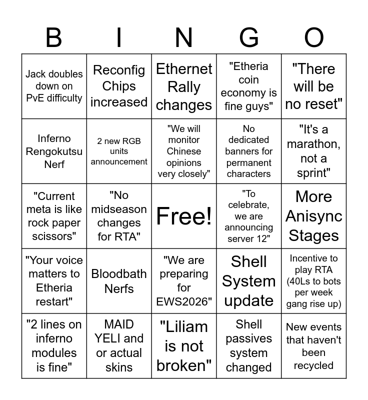 This bingo card has a free space and 24 words: Bloodbath Nerfs, MAID YELI and or actual skins, "We will monitor Chinese opinions very closely", "2 lines on inferno modules is fine", "There will be no reset", Jack doubles down on PvE difficulty, Inferno Rengokutsu Nerf, Reconfig Chips increased, "To celebrate, we are announcing server 12", "We are preparing for EWS2026", No dedicated banners for permanent characters, "Current meta is like rock paper scissors", Shell System update, Incentive to play RTA (40Ls to bots per week gang rise up), 2 new RGB units announcement, Shell passives system changed, More Anisync Stages, Ethernet Rally changes, "It's a marathon, not a sprint", "No midseason changes for RTA", New events that haven't been recycled, "Your voice matters to Etheria restart", "Etheria coin economy is fine guys" and "Liliam is not broken".