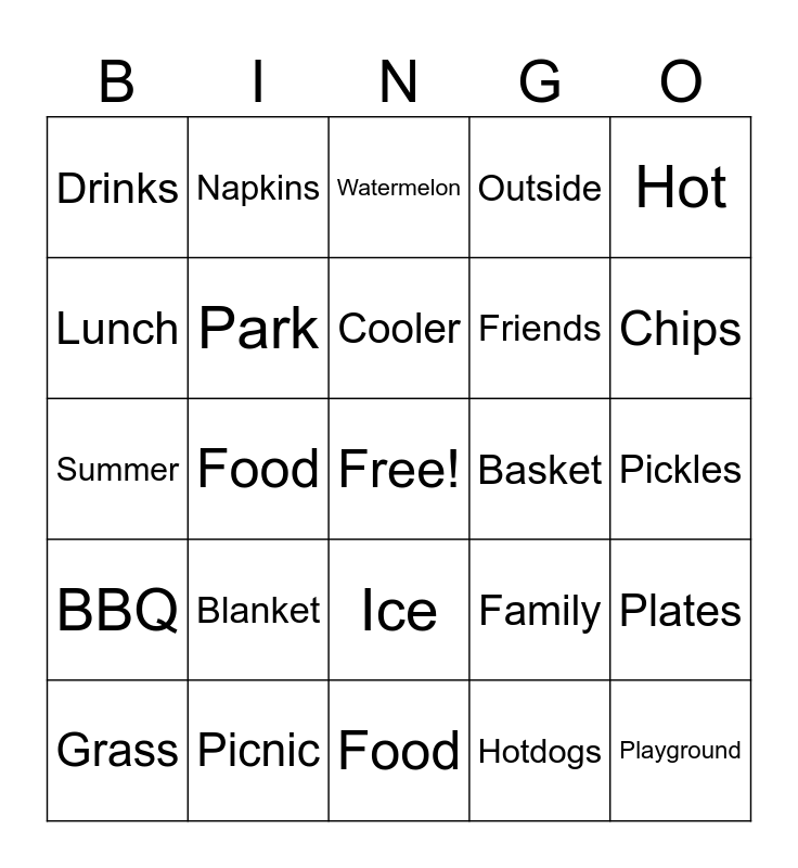 This bingo card has a free space and 24 words: Blanket, Picnic, Cooler, Grass, Hot, Drinks, Lunch, Napkins, Basket, Ice, Friends, Summer, Family, Plates, Park, Hotdogs, Pickles, Watermelon, Chips, Food, Playground, BBQ, Outside and Food.