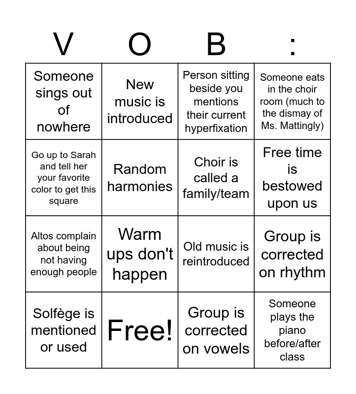 This bingo card has 28 words: Fine-apple mantra recited by/for the class, Tenor basses have off topic side conversations, Altos complain about being not having enough people, Ms. Mattingly mentions an upcoming event, Random harmonies, Person sitting beside you mentions their current hyperfixation, New music is introduced, Someone plays the piano before/after class, Free!, Jorge, Marley, and Jacob (all or any combo of the three) begin giggling for no apparent reason, Old music is reintroduced, Someone eats in the choir room (much to the dismay of Ms. Mattingly), Someone still doesn't have their folder, Warm ups happen, Warm ups don't happen, Ms. Mattingly asks a music theory question and four or less people raise their hand to answer, Sopranos begin to sing in the stratoshpere simply because they've been blessed with the ability to do so, Choir is called a family/team, Free time is bestowed upon us, Someone reminisces about a previous choir year, Someone sings out of nowhere, Someone screams, Solfège is mentioned or used, Group is corrected on rhythm, Group is corrected on vowels, Group is corrected on lyrics, Go up to Sarah and tell her your favorite color to get this square and Recite the entirety of "Rejoice With Exceeding Great Joy" by memory to Sarah to get this square.