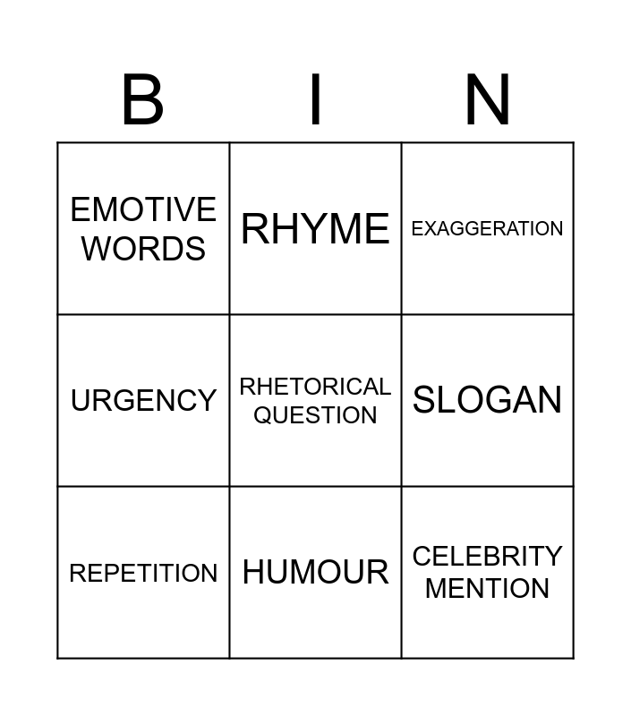 This bingo card has a free space and 8 words: SLOGAN, EXAGGERATION, RHYME, REPETITION, EMOTIVE WORDS, CELEBRITY MENTION, URGENCY and HUMOUR.