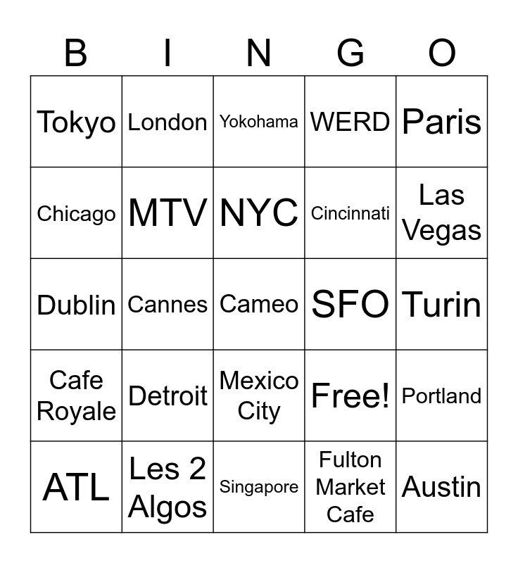 This bingo card has 25 words: Detroit, Singapore, NYC, ATL, Paris, Tokyo, Chicago, London, SFO, Mexico City, Cincinnati, Dublin, Free!, Portland, MTV, Austin, Turin, Yokohama, Las Vegas, Cannes, Cameo, Les 2 Algos, Cafe Royale, WERD and Fulton Market Cafe.