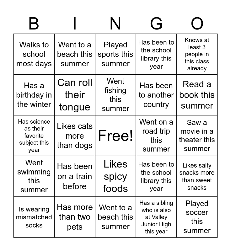 This bingo card has a free space and 34 words: Can snap their fingers, Has a sibling who is also at Valley Junior High this year, Played video games this summer, Can say the alphabet backwards, Went swimming this summer, Can roll their tongue, Knows at least 3 people in this class already, Is wearing mismatched socks, Went to a beach this summer, Tried a new food this summer, Went fishing this summer, Played sports this summer, Loves scary movies, Likes to build things with LEGOs, Went on a road trip this summer, Read a book this summer, Has more than two pets, Has science as their favorite subject this year, Has been on a train before, Has been to the school library this year, Likes spicy foods, Plays a musical instrument, Walks to school most days, Saw a movie in a theater this summer, Went to a beach this summer, Played soccer this summer, Has been to the school library this year, Takes the bus home from school, Has been to another country, Has a birthday in the winter, Already has homework this year, Likes cats more than dogs, Likes salty snacks more than sweet snacks and Likes to sing in the shower.