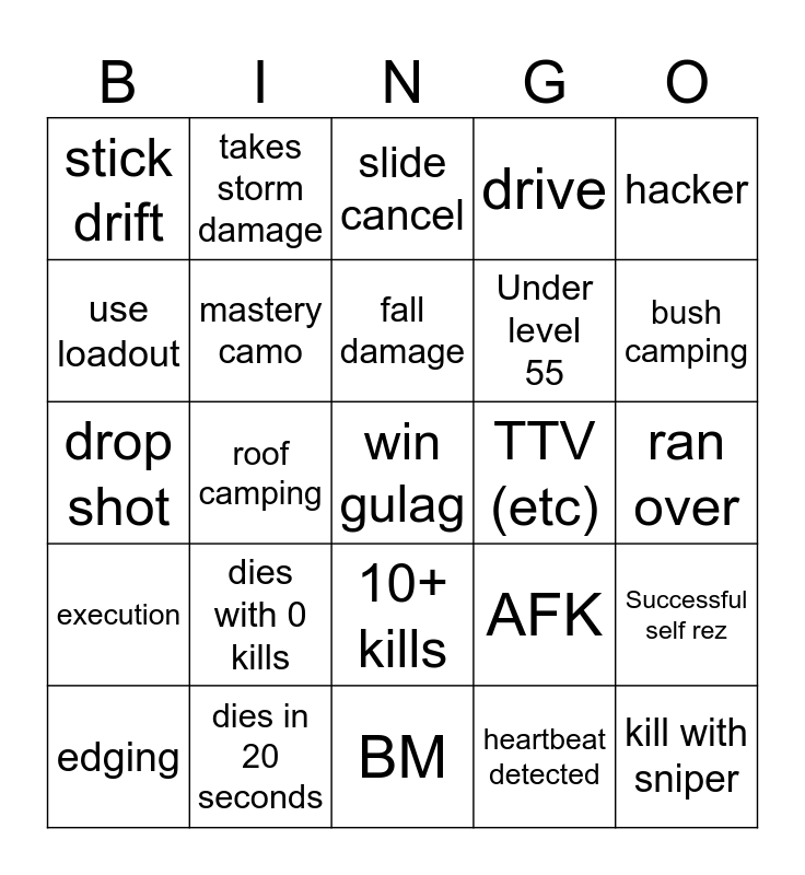 This bingo card has a free space and 24 words: dies with 0 kills, dies in 20 seconds, fall damage, edging, hacker, stick drift, use loadout, takes storm damage, TTV (etc), 10+ kills, Under level 55, drop shot, AFK, Successful self rez, mastery camo, heartbeat detected, ran over, slide cancel, bush camping, roof camping, kill with sniper, execution, drive and BM.